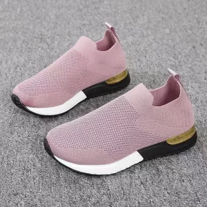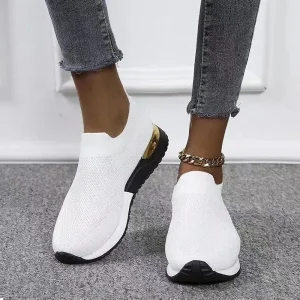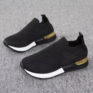 [Fabric]: Crafted from a breathable knit fabric, these women’s slip-on sneakers offer both comfort and flexibility, making them perfect for everyday wear. The high-quality knit ensures your feet remain cool and comfortable throughout the day, providing an ideal balance of support and style.[Fit]: With a streamlined and modern silhouette, these sneakers feature a flat heel design that adds to the overall sleek look while ensuring comfort during long periods of wear. The lightweight construction makes them easy to wear for extended casual outings.[Design Highlights]: The sneakers boast a striking gold accent on the heel, which adds a touch of elegance and sophistication to the sporty style. Designed with a convenient loafer-style closure, they ensure quick and easy wear.[Occasions]: Perfect for daily activities such as running errands, walking in the park, or casual hangouts. These versatile sneakers can be paired effortlessly with a variety of outfits, making them a staple for both sporty and casual settings.[Size Information]: Available in a broad range of sizes from EU 36 to EU 43, catering to different foot sizes and ensuring a great fit. These sneakers are designed to suit various style preferences and needs, providing a versatile choice in women’s casual footwear.