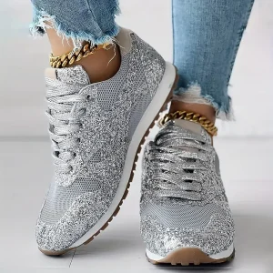 1.Toe Shape: Round Toe2.Upper Materials: Sparkling Glitter Mesh3.Outsole Materials: Rubber4.2025 Trends: Silver Bling Bling Sneakers
